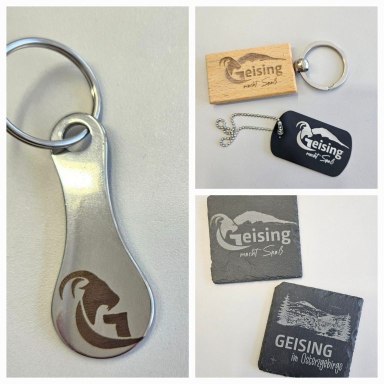 Wir können viele Materialien gravieren, eigentlich geht fast alles. Im Bild seht Ihr Metall, Holz und Schiefer. Die Motive sind Euch überlassen.